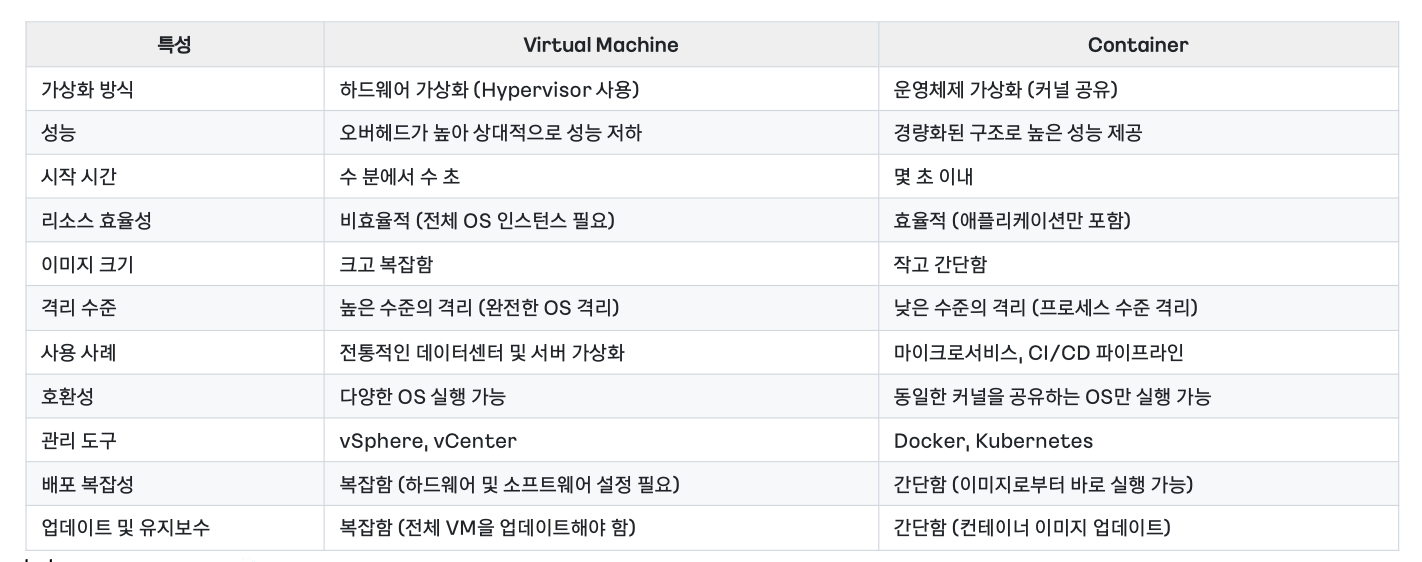 - 경량성 : 호스트 운영 체제의 커널을 공유하기 때문에 가상머신보다 가볍고 빠른 실행이 가능하다.