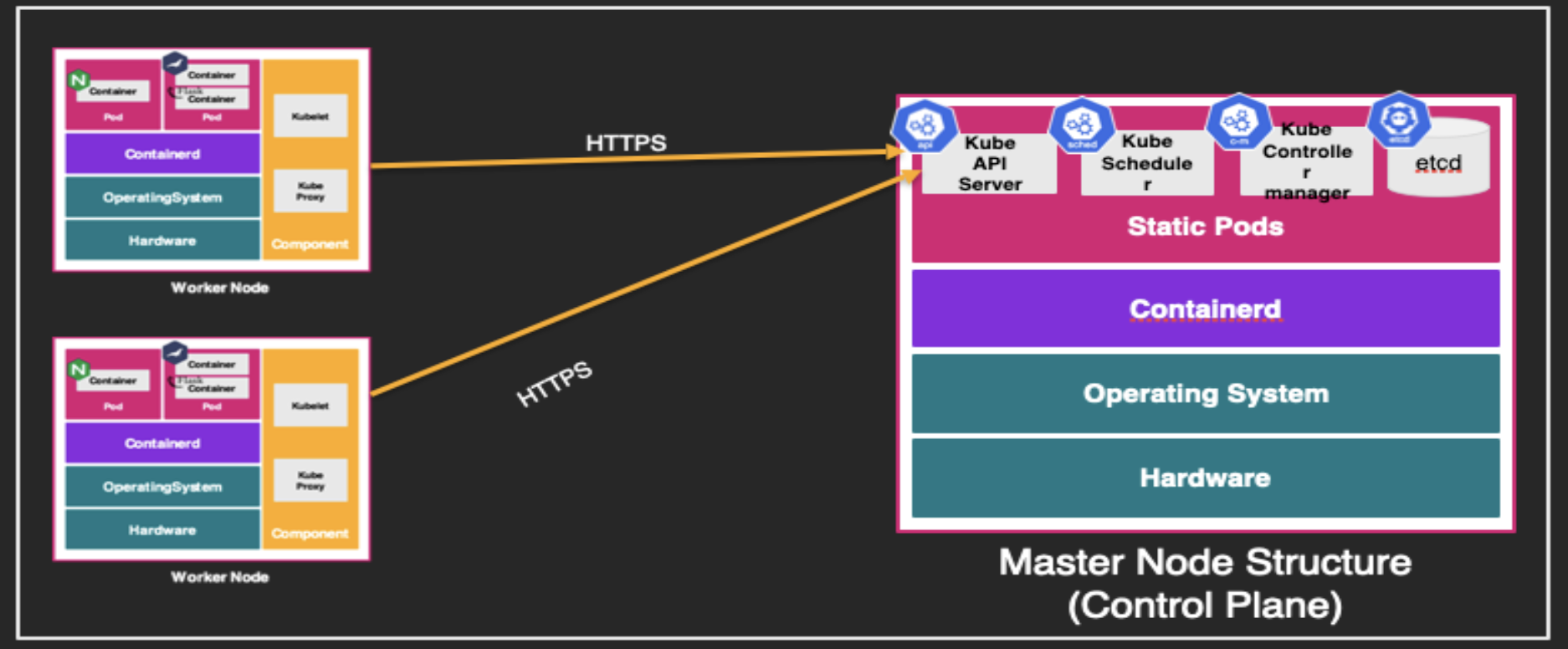 - cluster : 여러 대의 머신(노드)으로 구성된 그룹(마스터 노드와 여러 워커 노드로 구성)