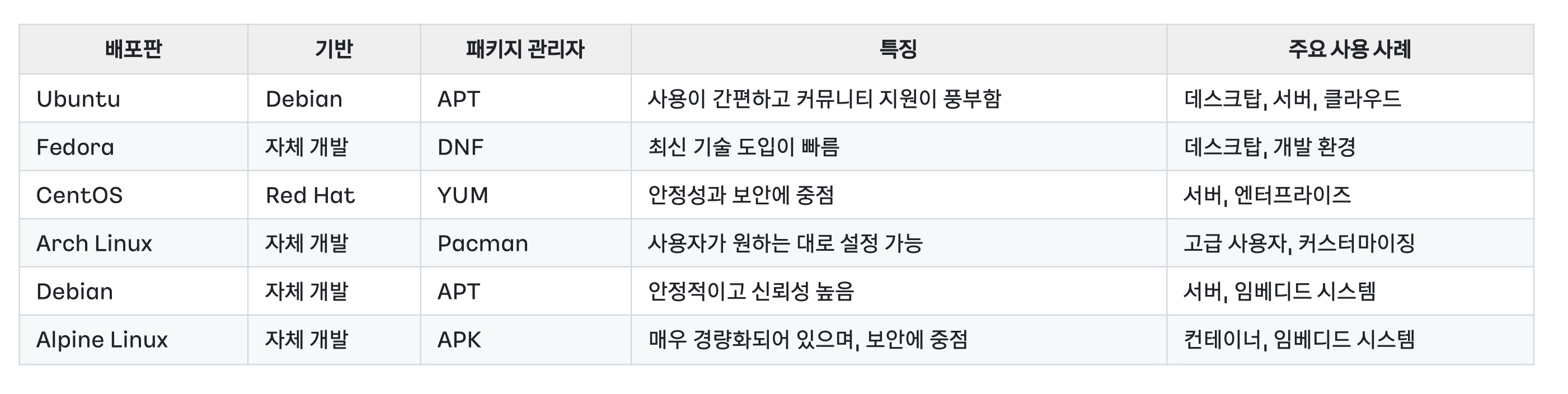- RHEL(Red Hat Enterprise Linux) : 레드햇이 개발한 상용 리눅스 배포판, 주로 기업환경에서 사용되며 고성능, 안정성, 보안, 지원 서비스 제공
