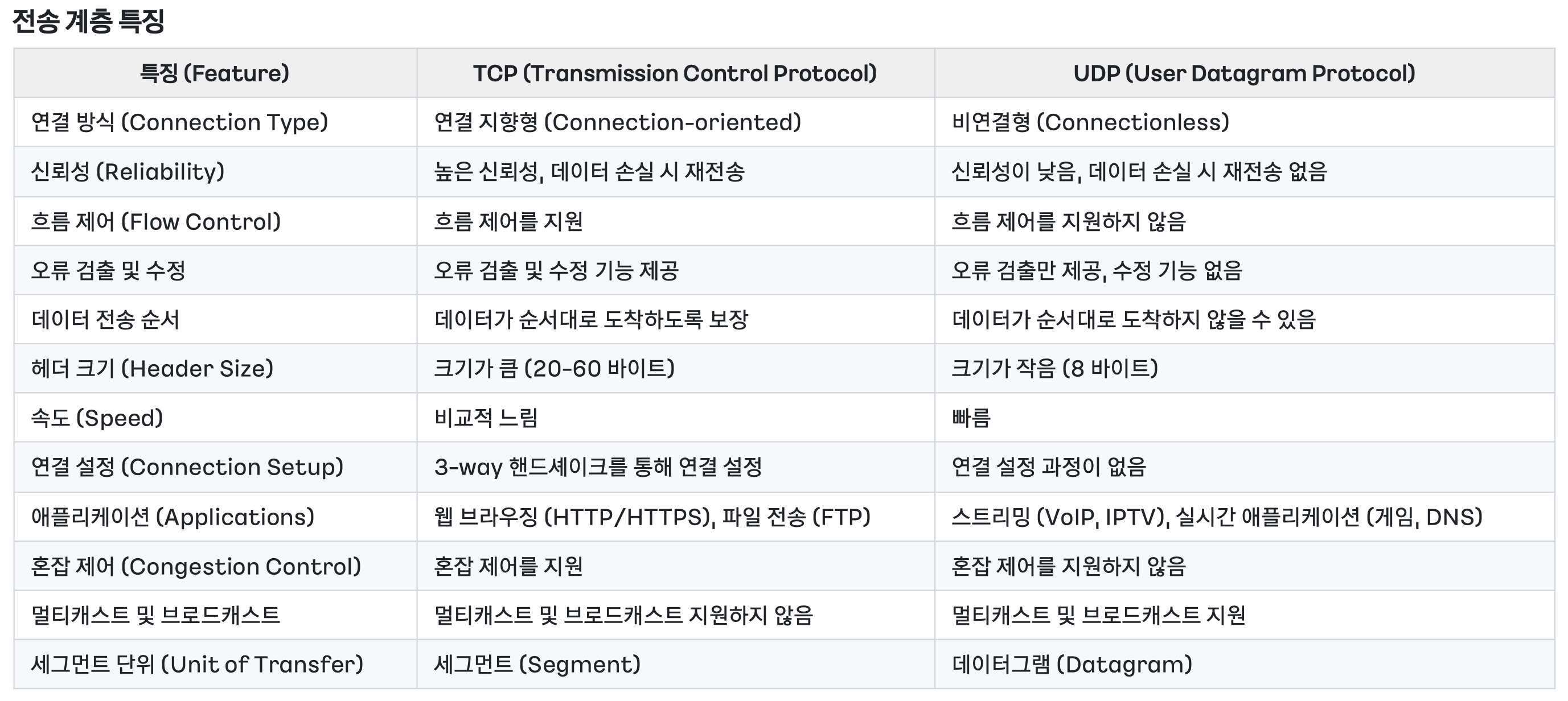 - 예 : TCP(Transmission Control Protocol), UDP(User Datagram Protocol