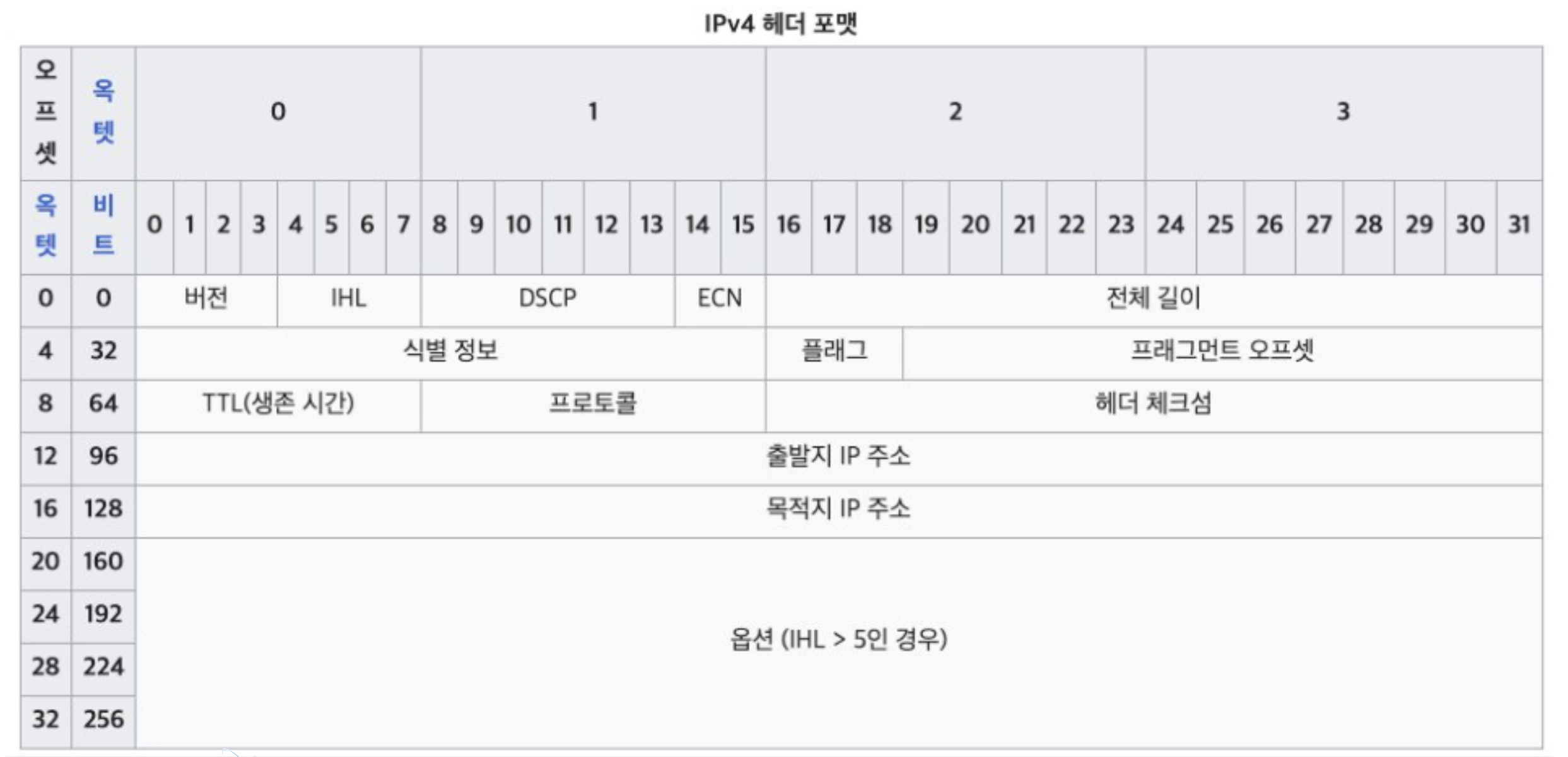 - 패킷 형식 및 구조 : 헤더와 데이터로 구성되며 헤더는 목적지, 출발지 주소, TTL, 프로토콜 정보 등이 포함